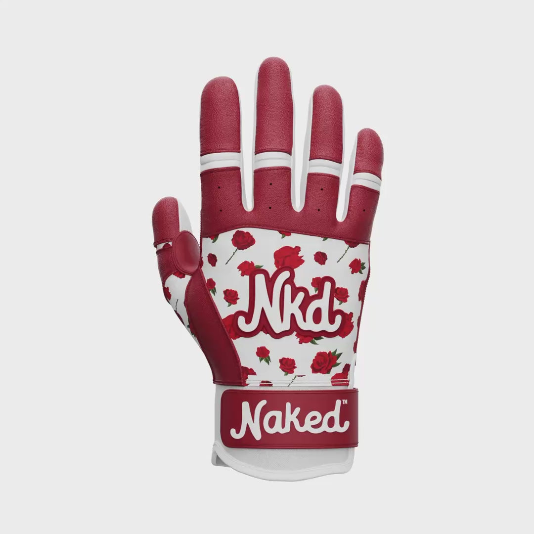 The Rose Batting Gloves are straight fire. Constructed with premium cabretta leather, fortified stitching, and deliberately placed leather reinforcement at seams and friction points. As with our grips, our batting gloves have been thoughtfully and intelligently designed for durability and the incredible comfort and barely there feel you've come to expect from Naked.
